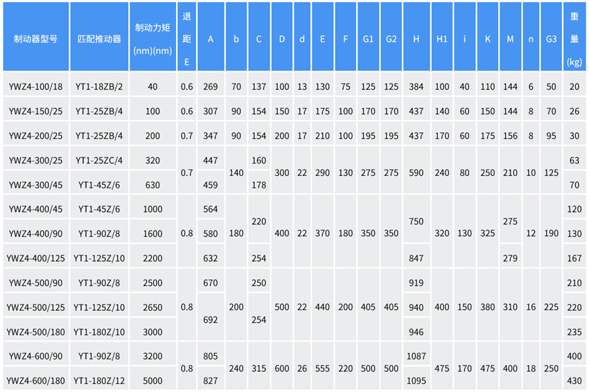 注:YWZ4系列的制動器匹配YT1推動器,替代原YWZB;